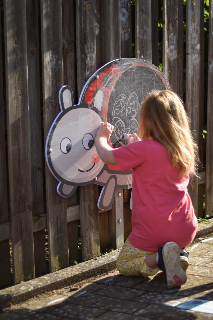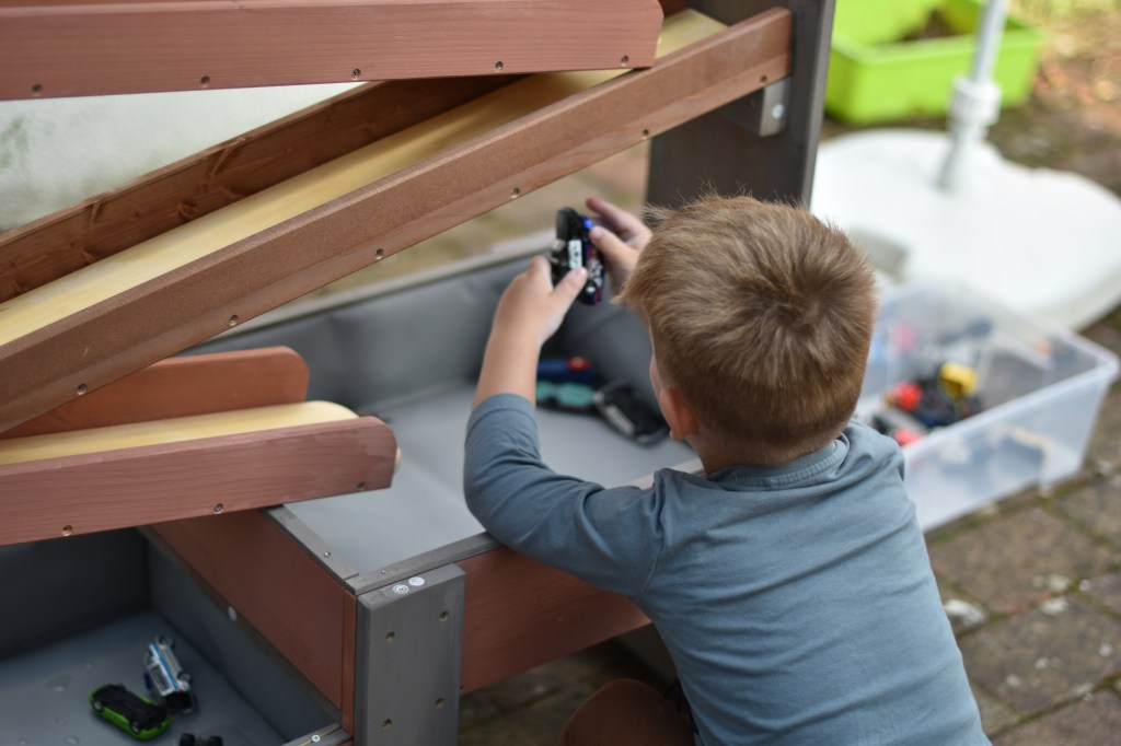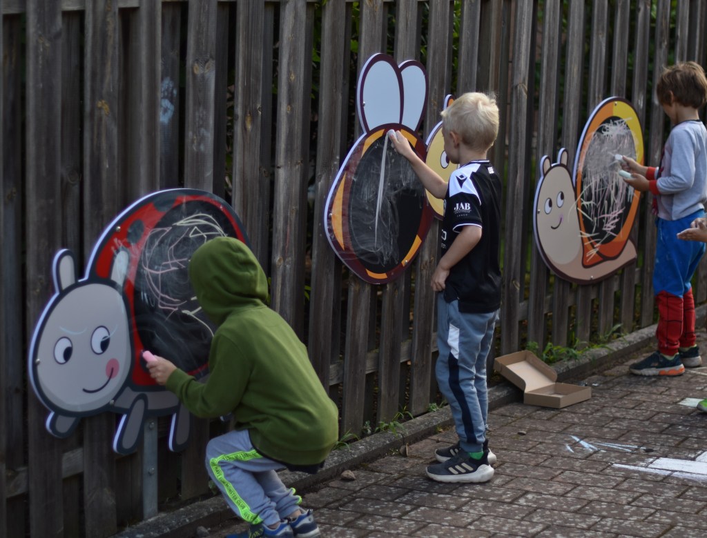 Gerade an warmen Tagen wird das Außengelände gerne als zusätzlicher „Gruppenraum“ genutzt. Hierfür wurden Kreidetafeln, eine Wasserbahn, eine Matschküche und ein Spieltisch für Wasser und Sand angeschafft. Nun haben die Kinder auch hier mehr Möglichkeiten sich an warmen Tagen abzukühlen und zu beschäftigen.